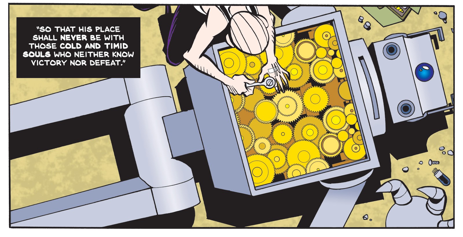 "Basically I had to decide if I was telling a science fiction story or a fantasy story (I think it’s fair to say Superman himself could go either way), and the total impossibility of the Robot convinced me I was writing fantasy. If this were science fiction, I wouldn’t have filled his chest with gears; since it’s fantasy, and I thought gears looked cool and fit with some themes I develop later in the story, I went for it.