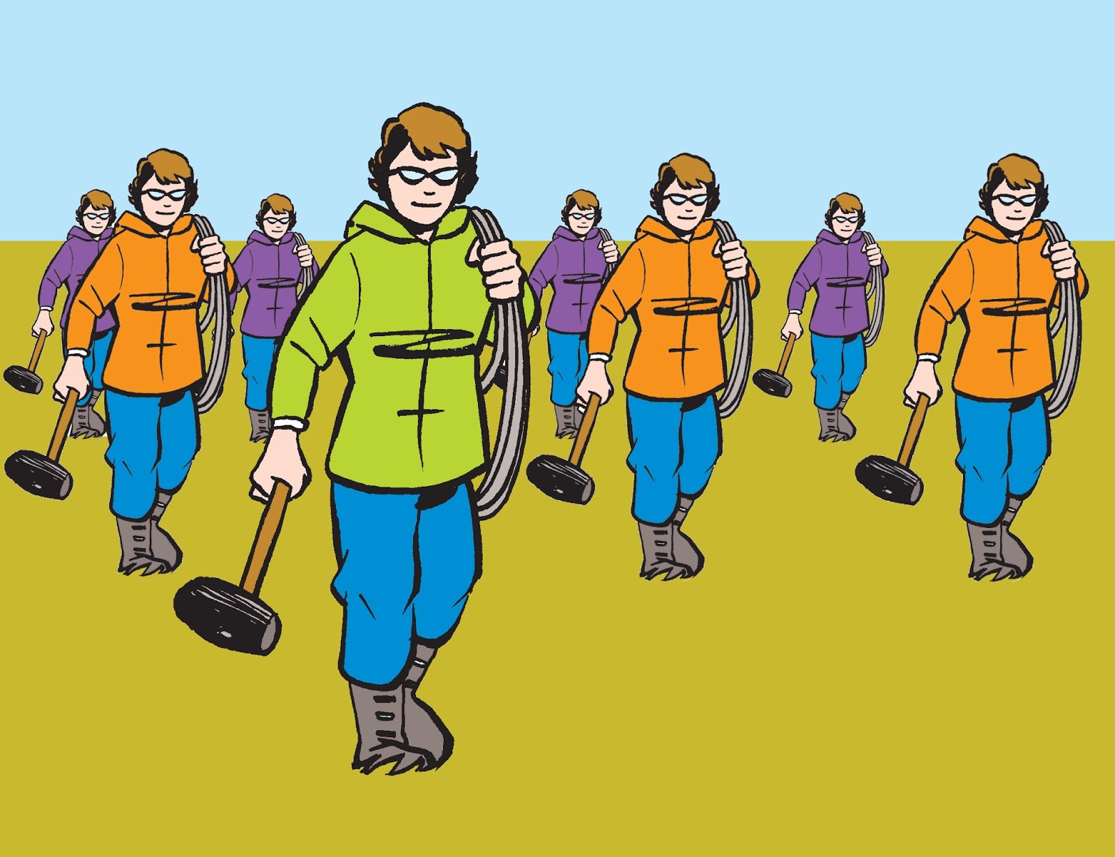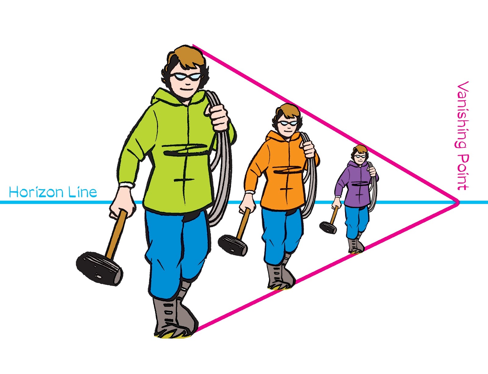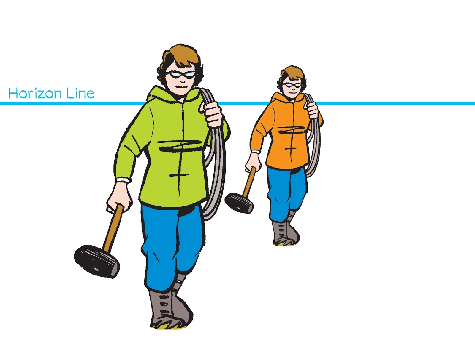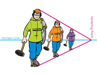 Once you know your horizon line and vanishing point(s), you can put your people anywhere, then create a world of railroad ties, telephone poles, buildings, trees, roads, earth and sky for them to live in. (And look at how all their shoulders line up with the horizon!)