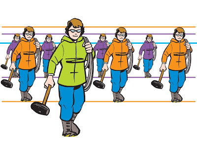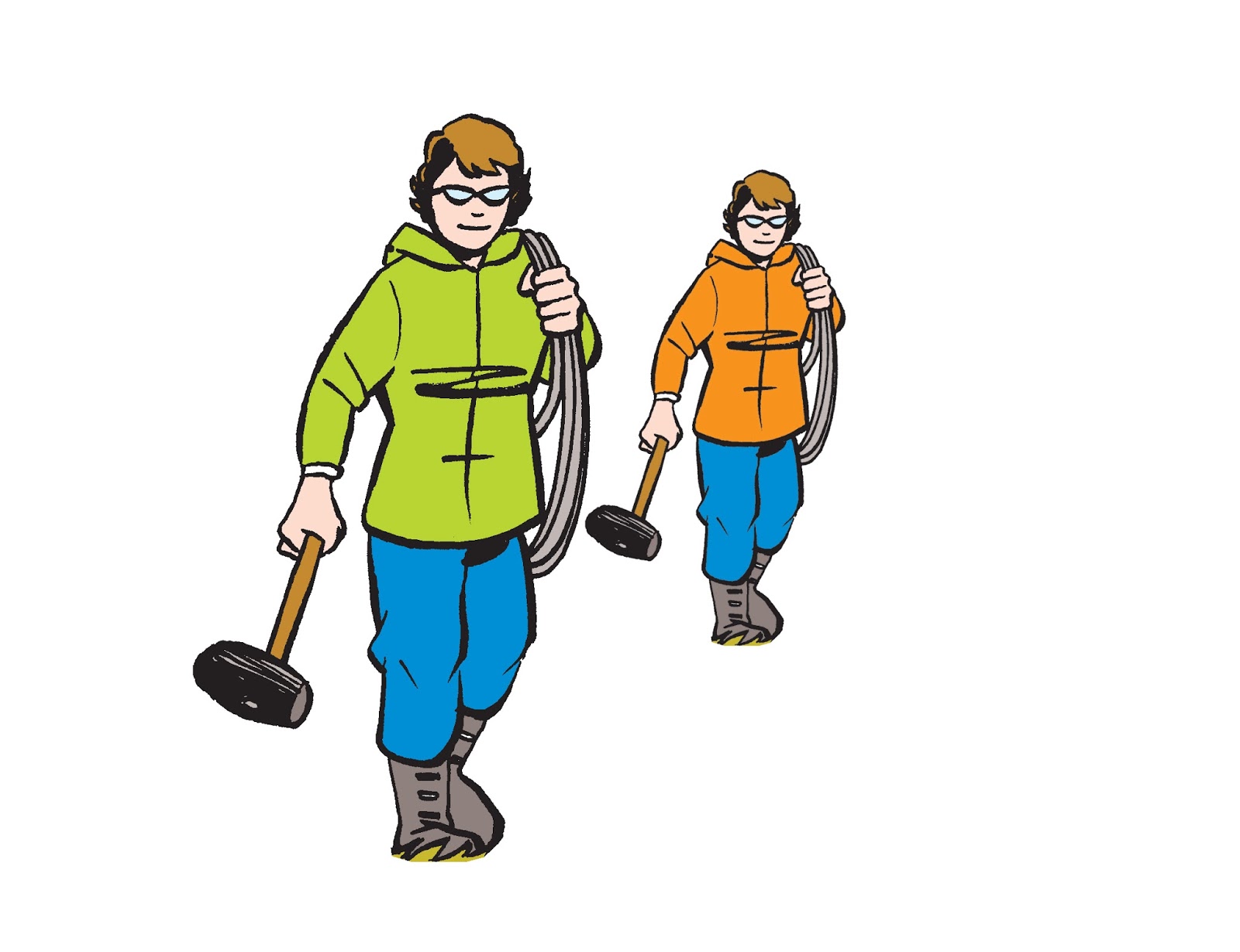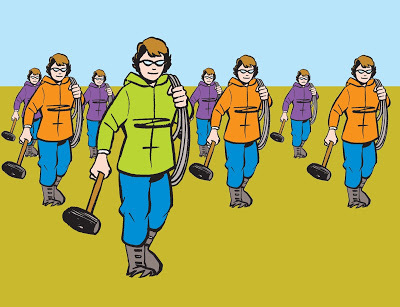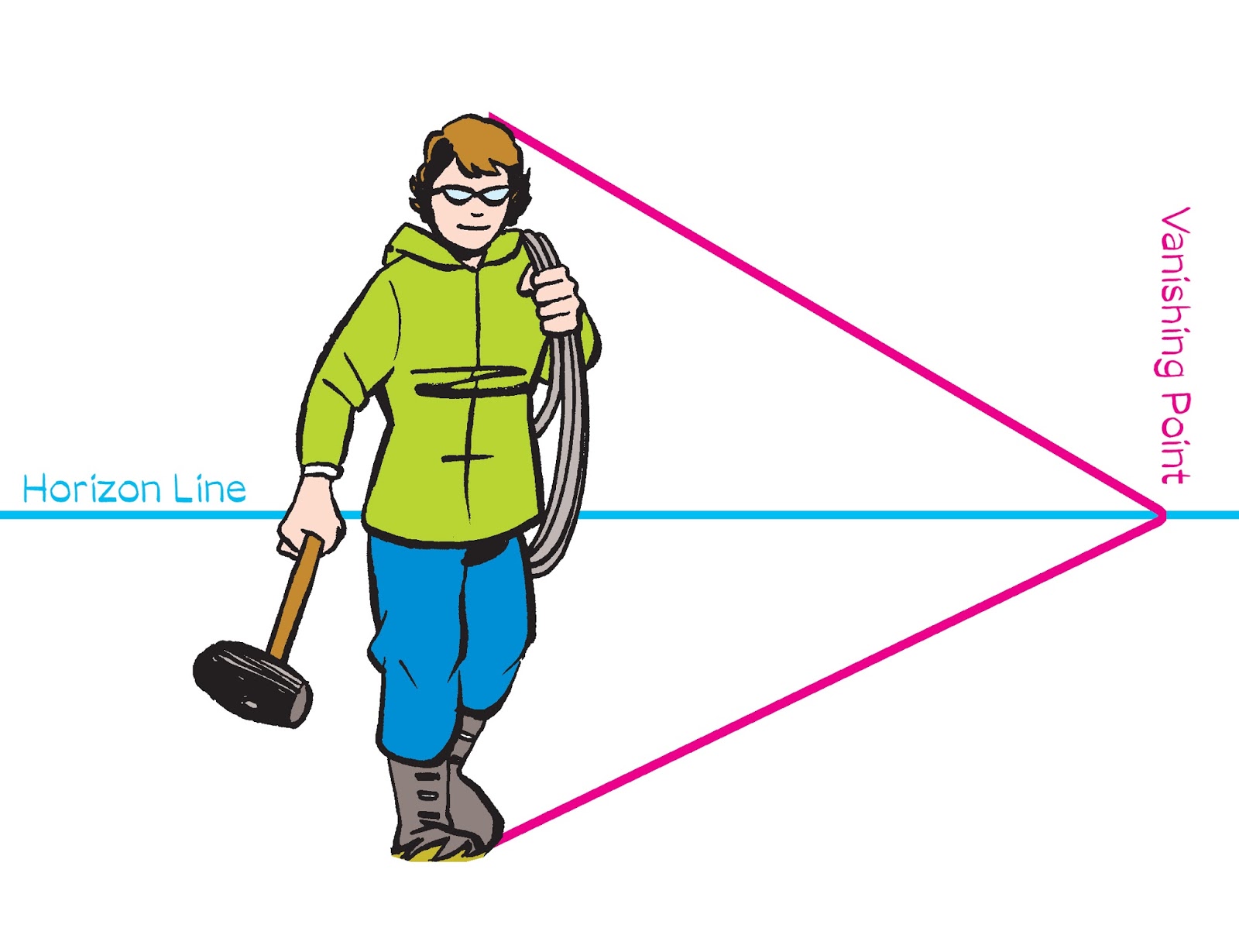 Once you know your horizon line and vanishing point(s), you can put your people anywhere, then create a world of railroad ties, telephone poles, buildings, trees, roads, earth and sky for them to live in. (And look at how all their shoulders line up with the horizon!)