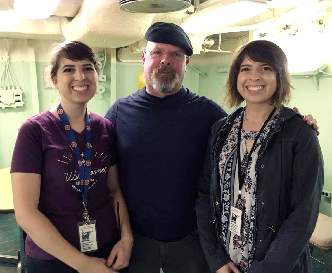 And I was glad I asked for this photo with my daughters Laura, the Hornet exhibitions designer, and Robin the archaeologist. They took most of the above photos for me and turned out to be excellent celebrity wranglers, escorting Jamie through the maze below decks.