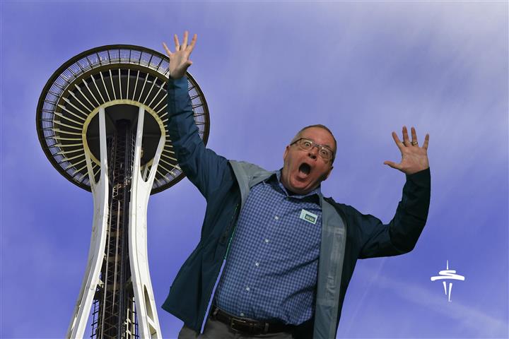 The Space Needle does that thing where they ask visitors to stand in front of a green screen to be electronically superimposed onto different backgrounds (it's free there, which it isn't most places). Since I was alone and didn't care, I asked the photographer if I could do something odd. She was game. Later, when scrolling through possible backgrounds, I saw this one, guffawed, and knew I'd found my match. You take one wrong step . . .
