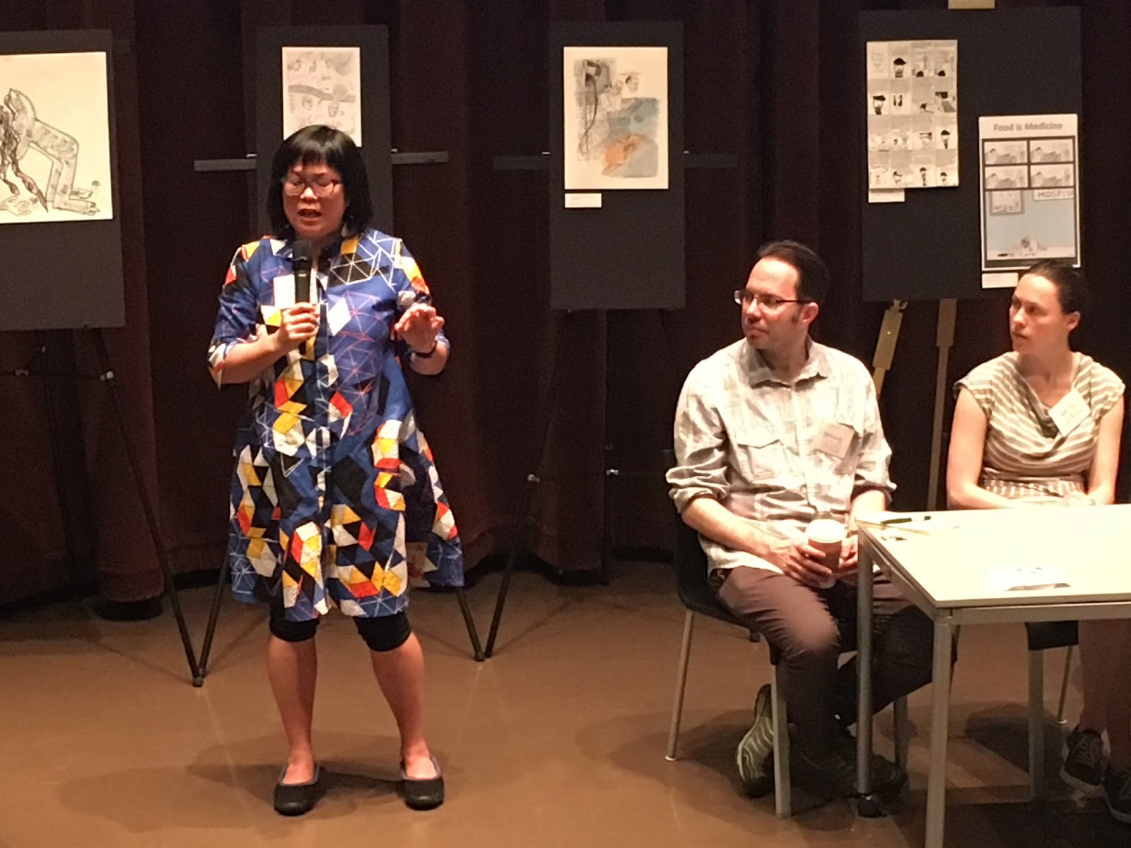 Conference co-planner Meredith Li-Vollmer, Eisner-winning cartoonist David Lasky, and Nikki Eller talk about public health comics they've made for King County (Wash.) that have been translated into two dozen languages. Behind them is original art for a silent auction.