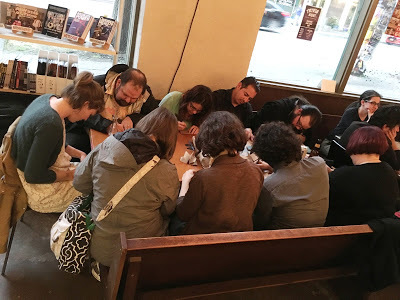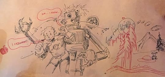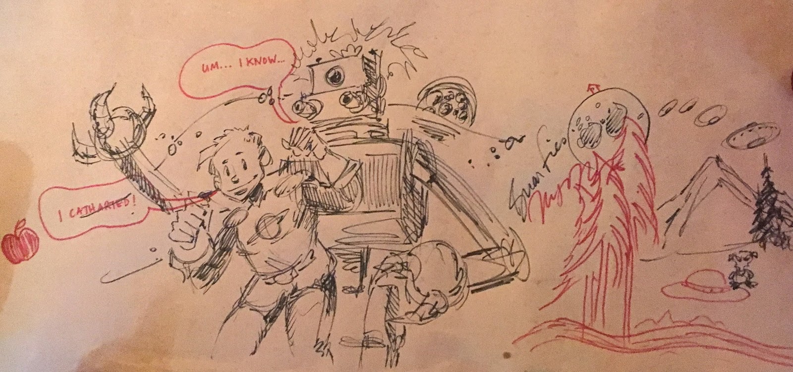 So later at the Raygun I did a doodle of my Last Mechanical Monster and the Cosmic Kid, to which my friend Mita Mahato added the red word balloons "I Catharted" and "Um...I know." And then we just doodled together while we talked, adding a mountain landscape, UFOs, and a little outhouse on the Moon in a way I haven't since my kids and I drew on restaurant placemats when they were toddlers. (An outhouse door on the Moon has a crescent Earth!) I highly recommend it.Seattle