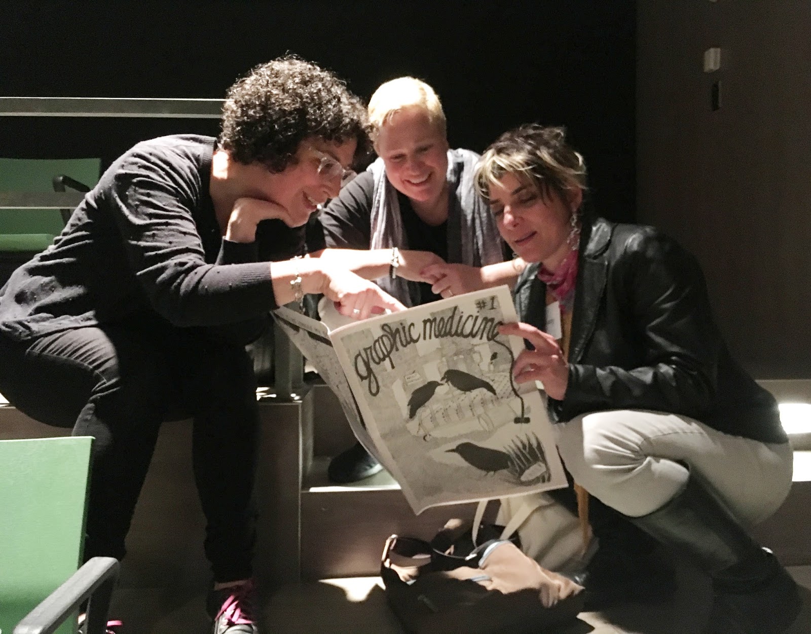 Tangles cartoonist Sarah Leavitt, MK, and Marbles cartoonist Ellen Forney pretend to peruse an anthology of comics produced for the conference because they saw my camera and wanted to look impressive.