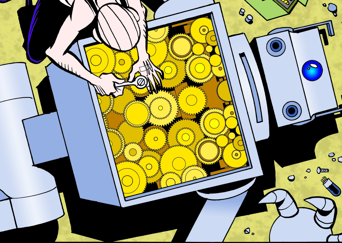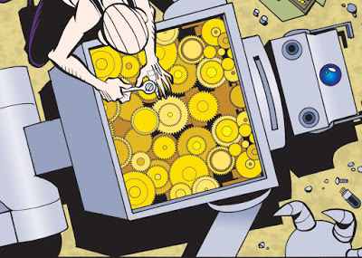 I had a comment/reply on my "Last Mechanical Monster" webcomic, currently running on GoComics.com, I thought was interesting enough to share. (Background info: my story is a sequel to a 75-year-old Superman cartoon.) A reader questioned a drawing in which I showed my Robot full of gears, saying gears'd be too heavy and slow. My reply is a good example of how I approach a story: