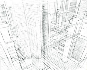 Three-point perspective I did for "Whatever Happened to the World of Tomorrow?"I see a lot of artists complain that drawing in perspective is hard. I don't understand that. It's one of the first things they teach in middle school art class, and mastering it should be as fundamental to any artist as using a hammer is to a carpenter. Whenever a drawing isn't "working" for me, it's often because I haven't thought through its perspective; once I do that, the composition fixes itself.