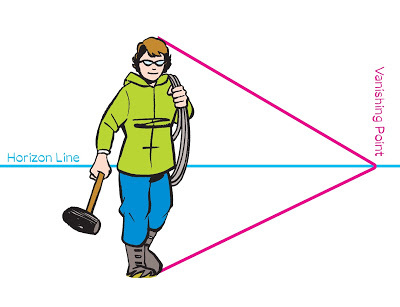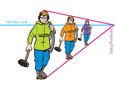 The horizon line is literally that: the line that divides earth from sky. Then, assuming other figures are the same height as the first, fitting them within those perspective lines will make them all look the same size.