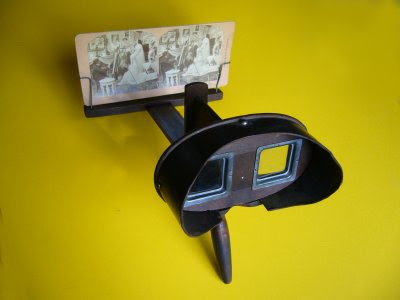 Friends and long-time readers of this blog know I love 3D images, and have even dabbled in making them myself. I've also got a small collection of antique stereographs: pairs of photos printed on thick curved cardboard that are viewed through a stereoscope to show a 3D picture. They were early View-Masters. At the turn of the 20th Century, most well-appointed parlors were equipped with a viewer and a cabinet full of 3D cards to entertain guests, bringing the exotic wonders of the world to people who'd never see them otherwise.