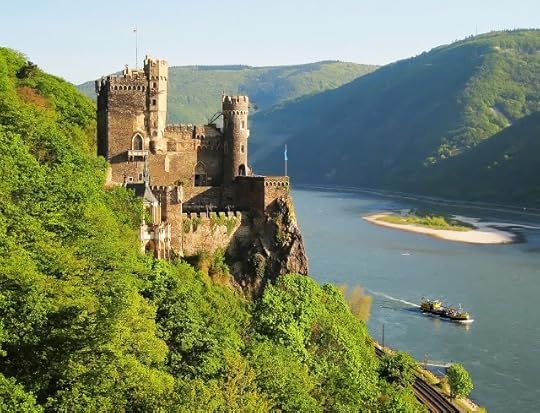 Here's a modern photo of Rheinstein Castle taken from nearly the same vantage point. Some features are different, others are the same. It's interesting that the perilous-looking steps with curved railing that lead to the right-most tower look like they haven't changed in a century.