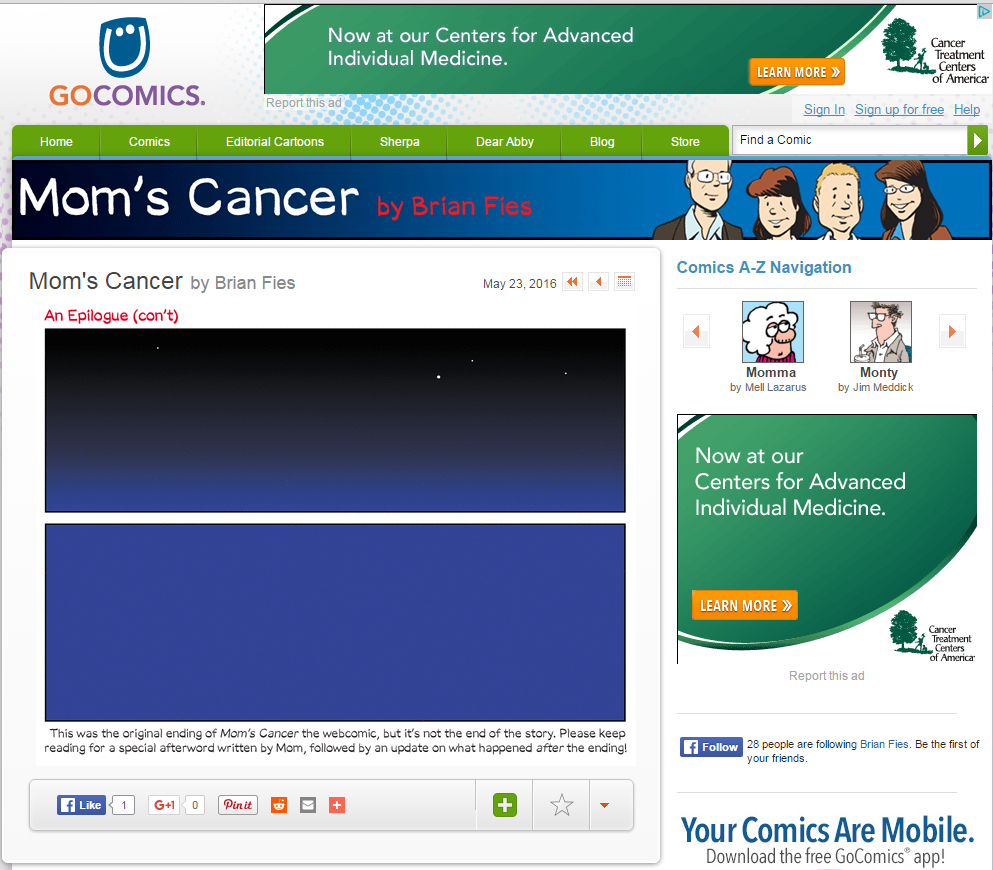 I haven't exactly trumpeted it from the towers, but Universal Press, the comic strip syndicate that runs GoComics, has been posting two pages of Mom's Cancer per week online since April 2015. Readers can drop in casually or subscribe to as many comic strips as they want. Mom's Cancer has 858 subscribers, which is a comparatively small number (some GoComics strips have tens of thousands). The way I look at it, that's 858 more readers than I had before, plus an unknown number of readers who aren't subscribers.