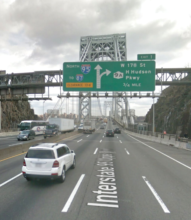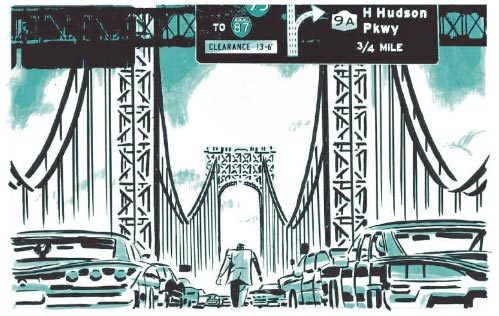 That highway sign at upper right breaks this drawing's symmetry and makes it a lot more interesting. It also provides exposition: even if the reader doesn't recognize the George Washington Bridge on sight, an elaborate suspension bridge combined with the name "Hudson" (as in "River") hints at where the character's going: New York City.