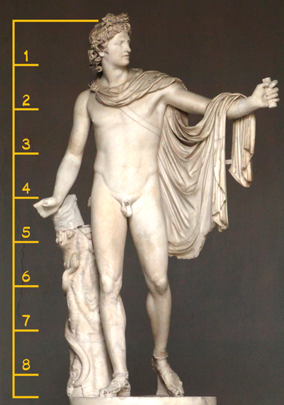 This ancient Greek statue of the god Apollo has about the same proportions as the Superman drawing above.