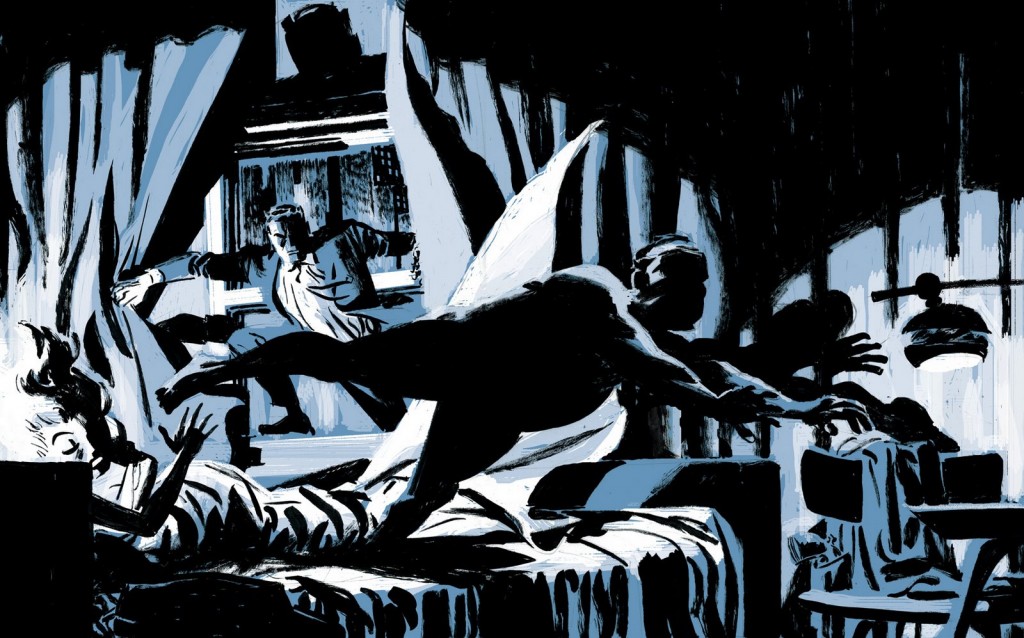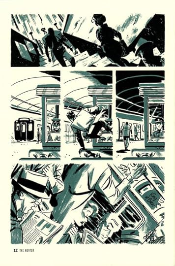 The panel immediately above, from Cooke's adaptation of Richard Stark's Parker novels, shows one way in which Cooke outgrew his animation foundation: brushwork. I don't know enough about Cooke's methods to know if he used actual brushes to put ink on paper, or electronic styluses to put pixels on monitors, but it hardly matters. The controlled looseness of his ink line (or virtual ink line?) wouldn't work for animation but fits right into one of comics' oldest and finest traditions.