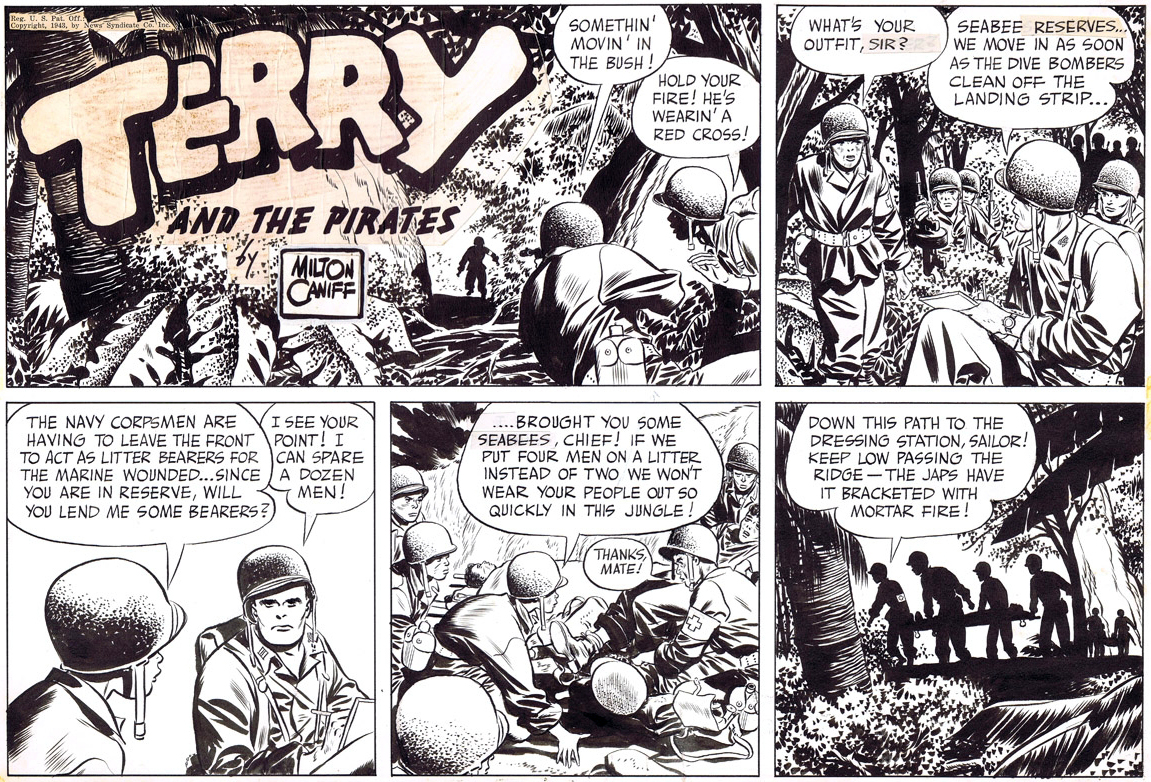 Laura helped put together an exhibition on "Cartoons at War" inspired by the recent find of some letters in the archives between a sailor on the Hornet and famous cartoonist Milt Caniff in 1944. Caniff created the comic strips "Terry and the Pirates," and later "Steve Canyon," which both featured a lot of military action. Caniff wanted to get the details right so he regularly corresponded with soldiers and sailors. Full disclosure: I edited the exhibition's text panels for Laura, so I'm invested.