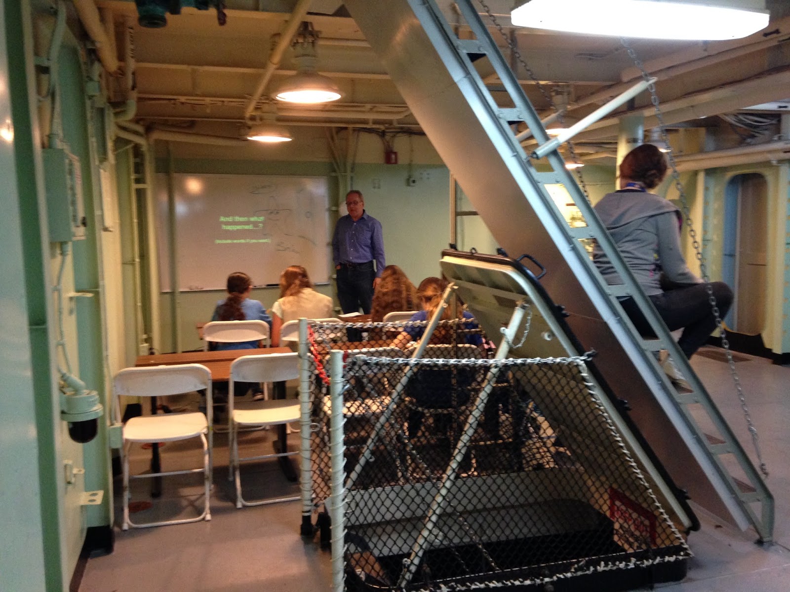 Corry's turn to talk. Her presentation was great. Then we talked to each other for five minutes, took a few questions (one boy just had to tell us how much he loved Snoopy), and were done after about 50 minutes.Immediately afterward I went to a small classroom below decks to do a Girl Scout Comic Artists Badge Workshop for a troop of six scouts. One of their mothers works with Laura on the Hornet (Hi, Chris!) and has wanted to do the workshop for a while, so we figured we'd kill as many birds with as few stones as we could. Attendance at the earlier talk was part of their requirement for earning the badge. It was a great group of girls, lively and attentive in all the right parts. By the end of the workshop everyone knew how comics are made and had drawn a four-panel (at least--some girls did much more) comic strip.