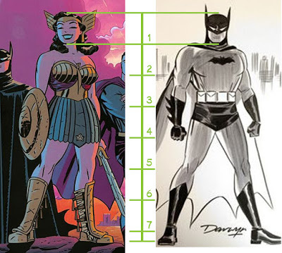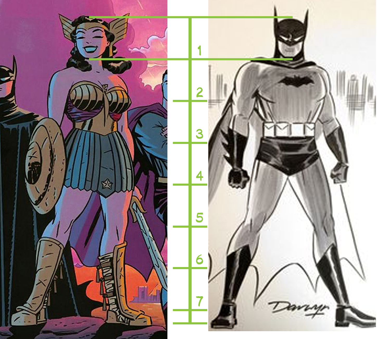 Since the ancient Greeks, artists have known that if you want to make someone look really heroic, give them a disproportionately small head (or, if you prefer, a disproportionately large body). Most real-life adults are about 7½ heads tall; most superheroes are at least 8 heads tall. Sometimes 9 or 10 or more.