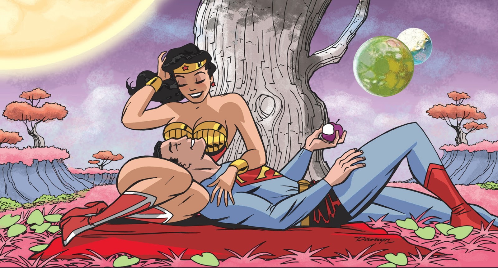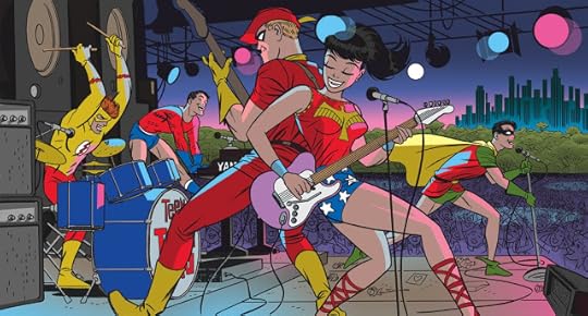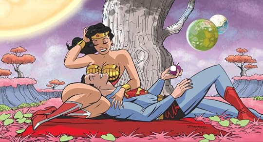 Wonder Woman and Batman, in atypically realistic proportions. Cooke's men have barrel chests but aren't muscle-bound. His women have broad shoulders and credible waists. His characters are thick and powerful. They have weight. To me they suggest circus performers in costumes--which were Siegel and Shuster's inspiration when they created Superman.