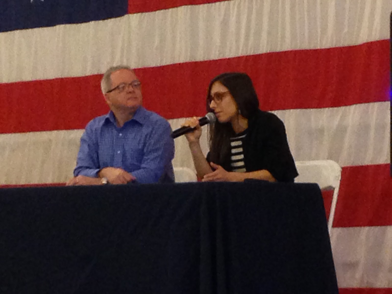 Corry introducing the Schulz Museum. We were speaking on the Main Stage in the Hangar Deck, which extends far to the left and right. At the right side of the photo is a flight simulator ride for entertaining the kiddies.