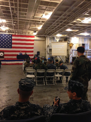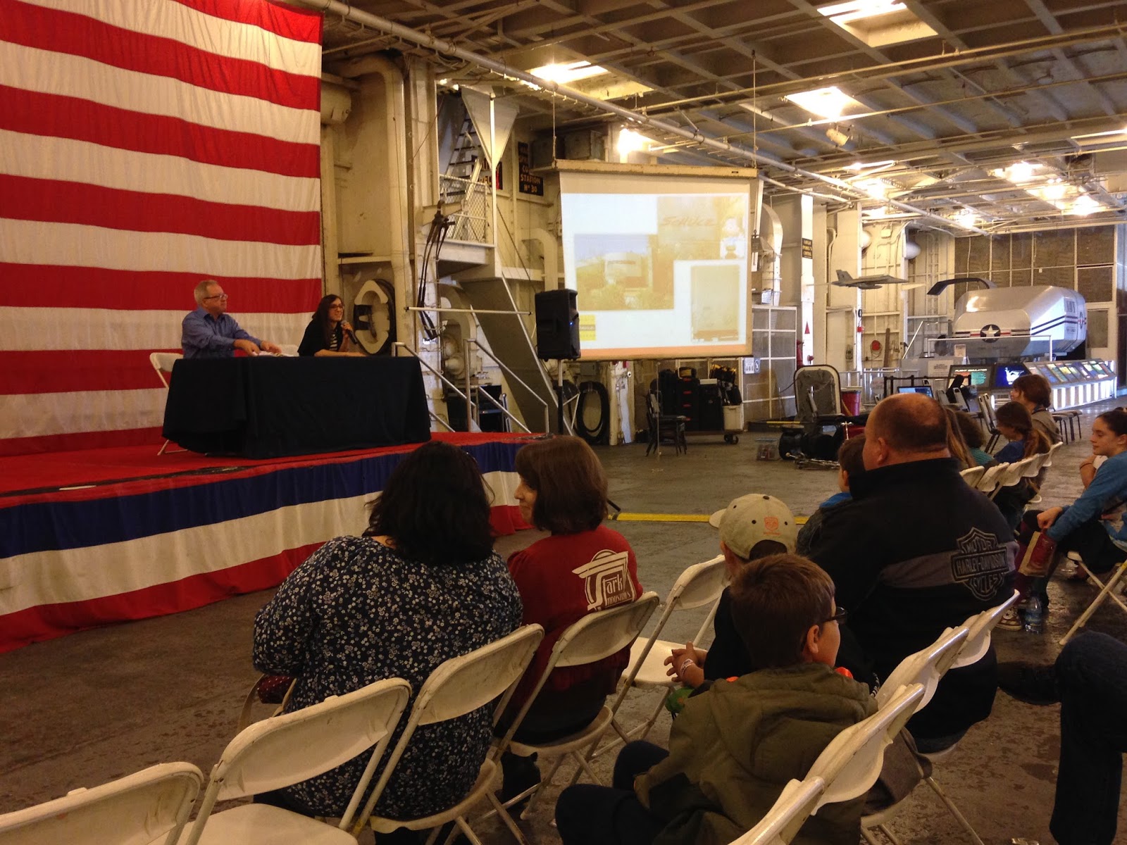 Corry and I are way up on the stage under the giant flag, projecting our slides on the screen at the right. The audience included a good-sized squad (or platoon or whatever) of recruits who spent the weekend training on the Hornet. Karen counted about 60 people in the audience, which I thought was a good turnout.