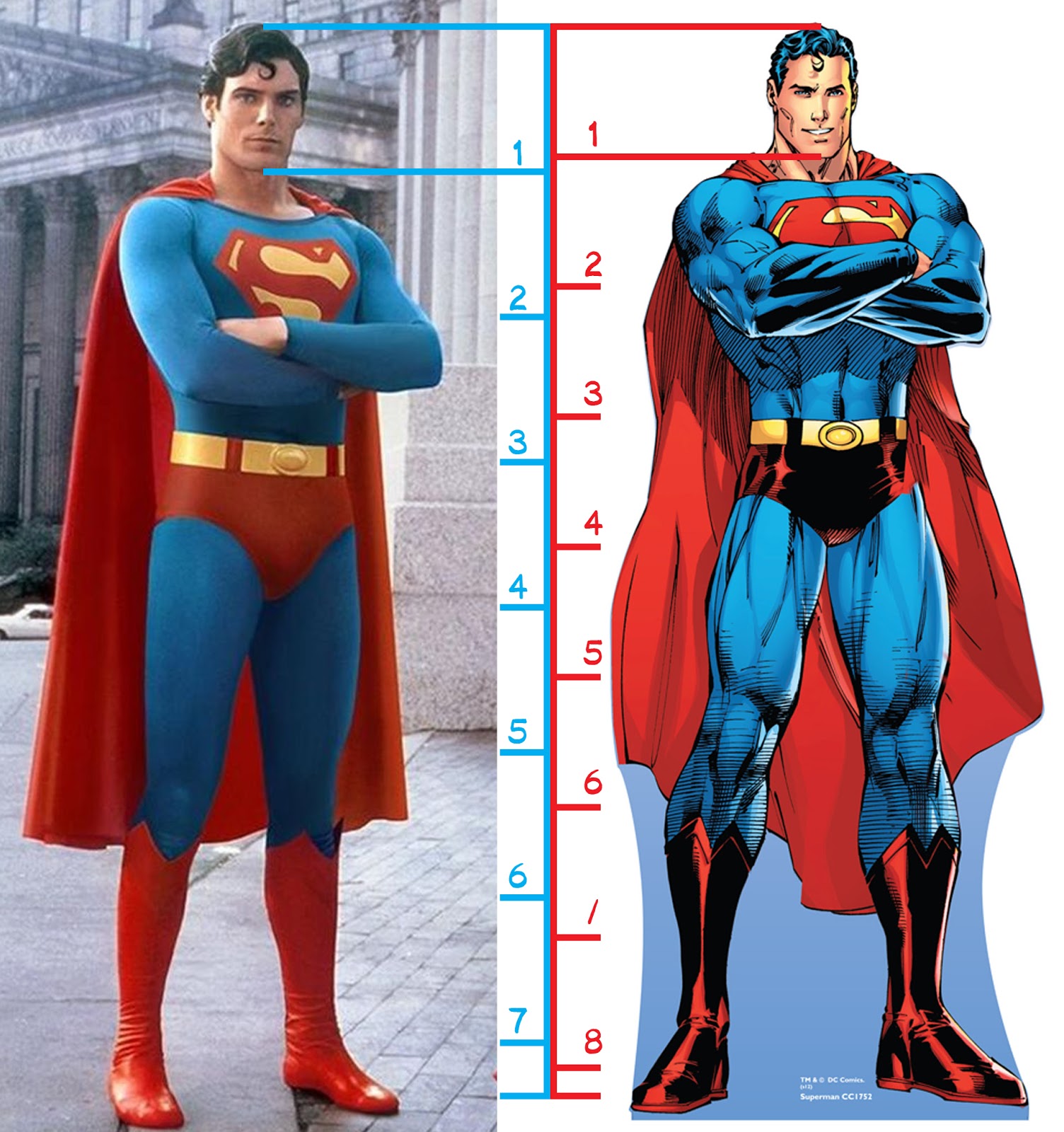 Christopher Reeve stood about 7½ heads tall, while the drawing of his counterpart on the right is more than 8 heads tall. Compare and contrast not just their muscles, but their other proportions (shoulders-to-waist, leg length-to-torso, etc.) as well. Tricks of the trade.