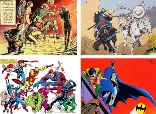 Some comics artists in the Illustrator tradition: (upper left) Alex Raymond, "Flash Gordon"; (upper right) Hal Foster, "Prince Valiant"; (lower left) John Buscema, "The Avengers"; (lower right) Neal Adams, "Batman."The artists I'm calling Essentialists take a different approach. The idea is that comics shouldn't necessarily try to mimic reality but instead embrace their built-in comic-ness. The ideal comic is one that distills reality to its essence, omitting anything that doesn't matter. Simplify, polish, pare. This approach is common among some types of comics--Charlie Brown's face is a masterpiece of minimalism--but unusual in superhero comics.