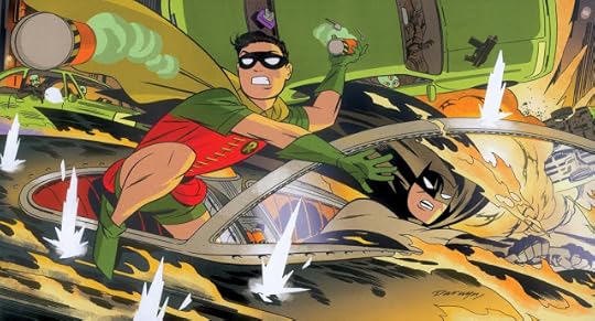 The first thing you see is Robin, throwing the grenade whose smoke trail leads back to him via the flow of his cape. Then you follow the line of Robin's outstretched arm directly to Batman, and continue to Batman's hands clenching the steering wheel. Maybe later you notice the chaos of cars speeding and tumbling through the background.