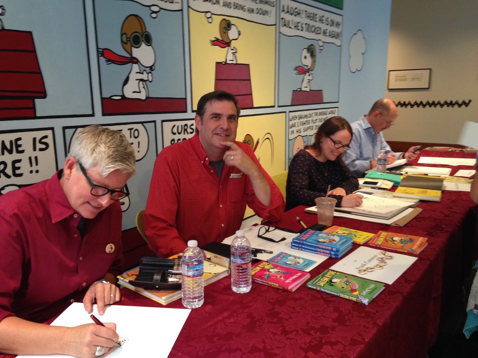 Paige Braddock (Schulz studio and "Jane's World"), Frank Cammuso ("Salem Hyde"), Raina Telgemeier (half the bestseller list), and Terry Moore ("Strangers in Paradise," "Echo") were seated near the front so they could all sign the 65th Anniversary Tribute book they contributed to.