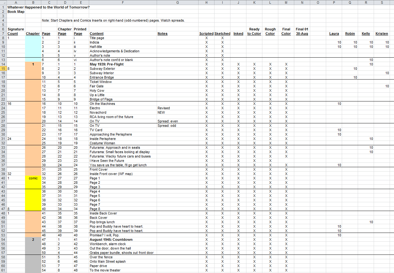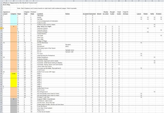 My book map in an Excel spreadsheet. The left column is the signature count, where I kept track of how many pages were in each half- or full-signature. The colored bars indicate chapters: blue is the front matter, orange/tan is Chapter 1, yellow is the first fake comic book insert (note that it follows Page 32, after which I restarted my signature count), followed by the remainder of Chapter 1 then the beginning of Chapter 2 in gray. Other columns provided a brief description to remind me what's on the page and check boxes to track my progress on each page. The final four columns tell me which pages I assigned to my Photoshop coloring assistants.At the same time, unknown to me, Editor Charlie had made his own book map. It's laid out differently to give him information he needs, and it's interesting to compare and contrast.