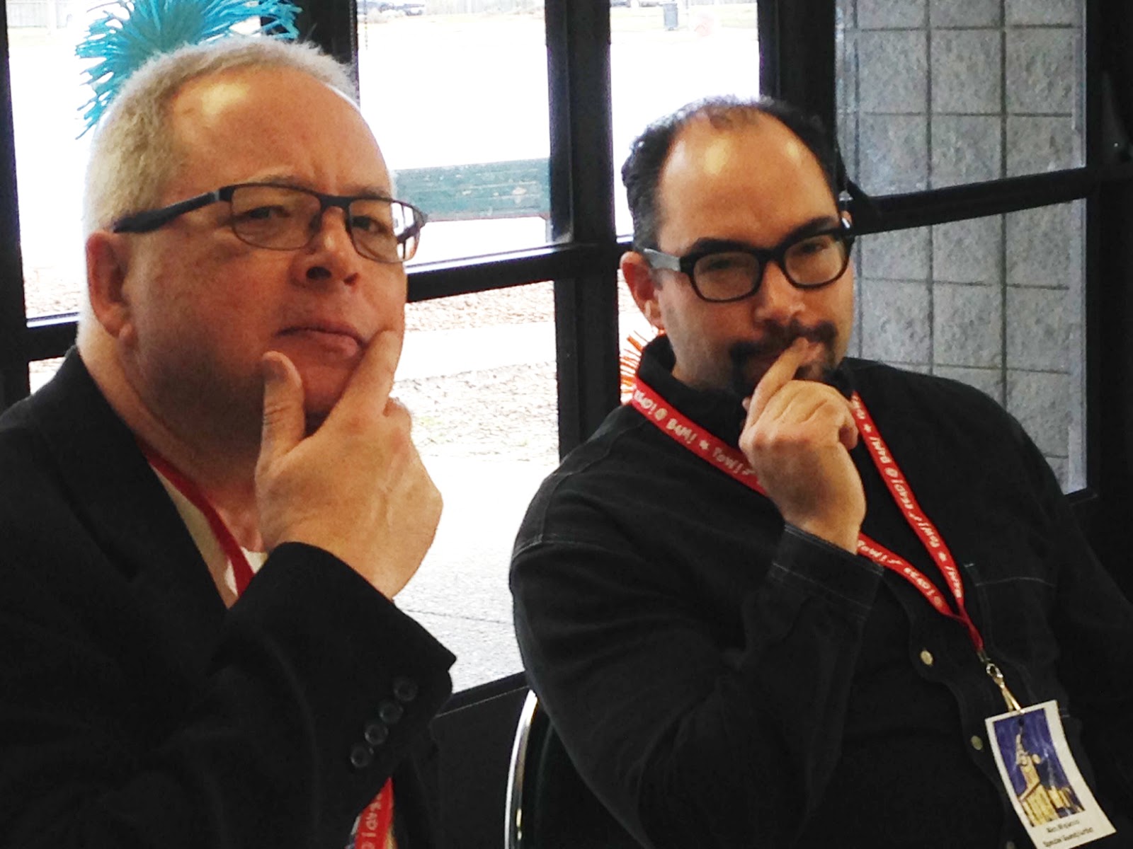 These are the expressions Karen got when she told us to "look thoughtful." Lex is better at thinking deep thoughts than I am.I don't mean to oversell it. After all, LumaCon is just a little comics convention, but I find it uniquely fun and satisfying. It's small, intimate, charming, low-key. The opportunity to mix with people who are just there because they love comics is rarer than you'd think. The people organizing it are motivated solely by their love of the medium and their students (they'd better be, because they're evidently forbidden to make a dime on it). They treat their guests right (cuff links!).