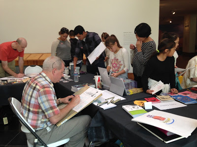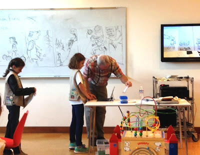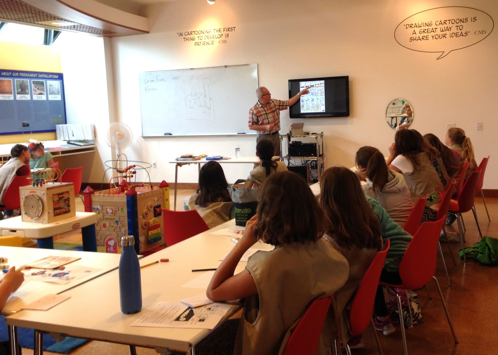 I started my day at the museum earlier than most, leading a three-hour workshop for Girl Scouts earning their Comic Artist merit badges. I've done a few of these before and they're always fun. We make jam comics and I talk about the history and conventions of the art form. To earn their badges the girls have to complete a four-panel comic strip applying all they've learned. My wife Karen, who has 20 years' experience in Scouts, is my faithful girl wrangler. She took most of the photos.