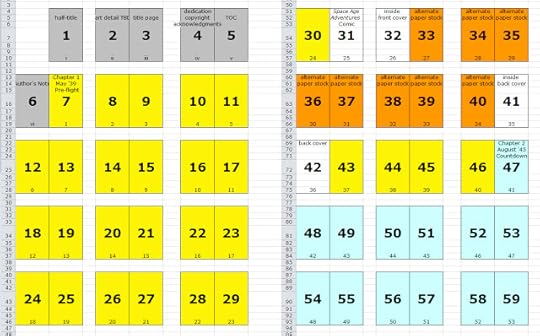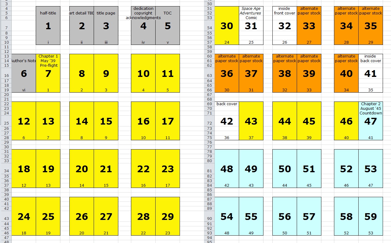 Charlie's book map, also in Excel. The gray pages are front matter, followed by Chapter 1 in yellow, the comic book insert in orange, and Chapter 2 in blue. Again, notice that the orange insert falls after Page 32. One nice feature of Charlie's map is it clearly shows Chapters 1 and 2 beginning on right-hand pages (pp. 7 and 47). Charlie also called out the front and back covers of the fake comic book (pp. 31, 32, 41, 42) but, in fact, they were printed on the same paper as the signatures before and after the inserts so no special attention was required.