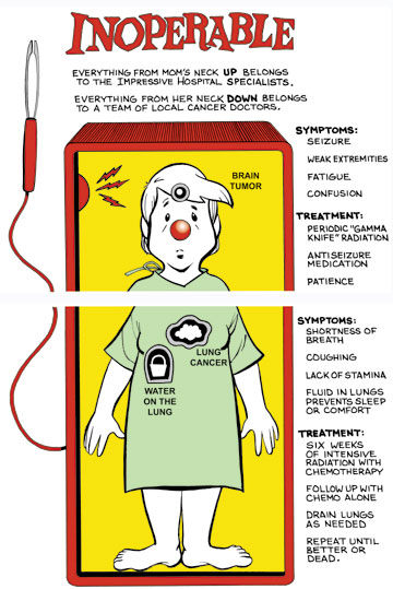 My friend thought I'd be interested because in Mom's Cancer, my graphic novel about my mother's experience with lung cancer, I drew two pages that looked like this: