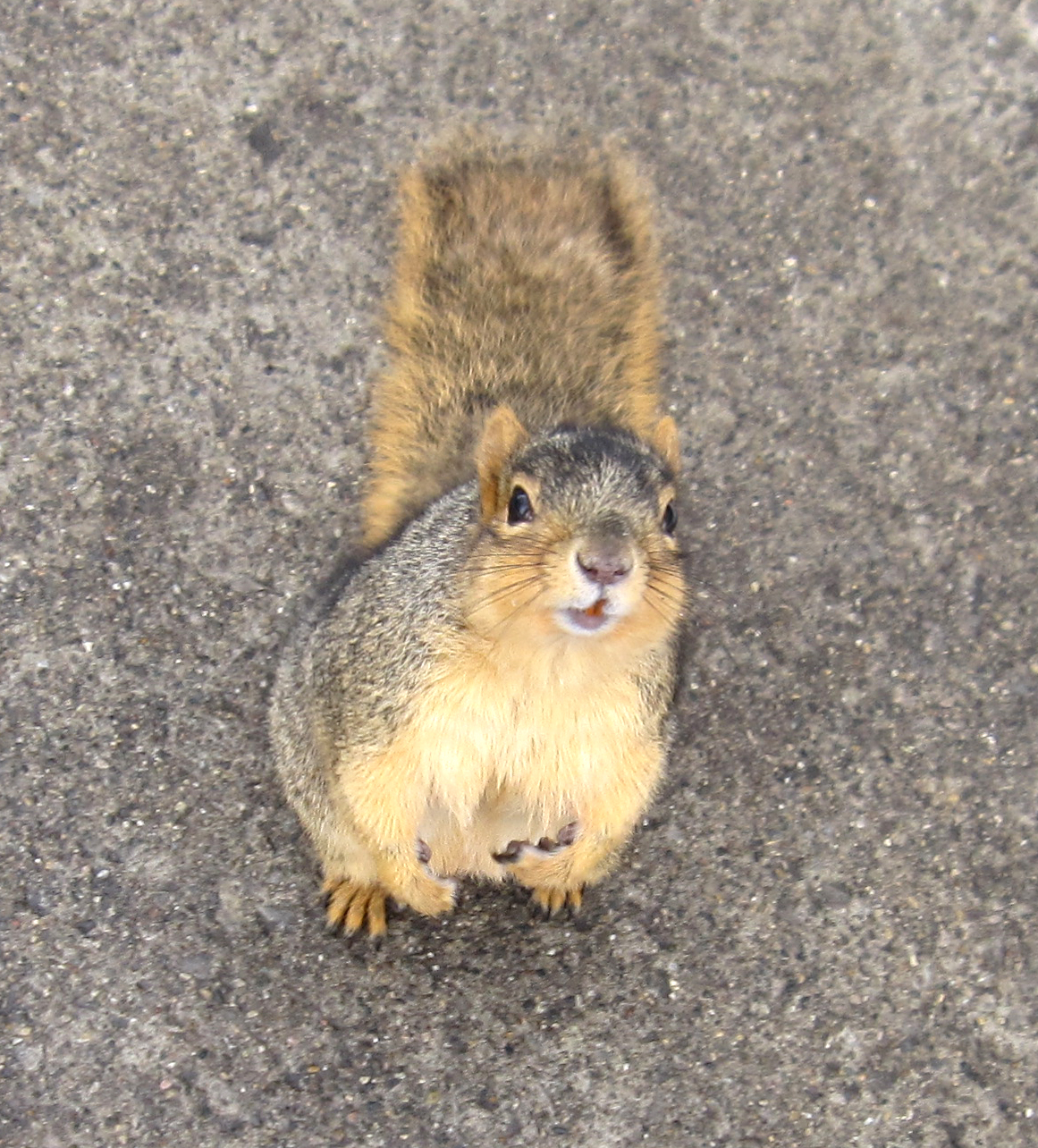 Weather was crisp but not unbearably cold, with an inch of dry icy show on the ground and occasional flakes drifting through the sky. The campus is home to roving gangs of squirrels that are fluffier, fatter and browner than those I'm used to, and nearly tame thanks to food handouts from big-hearted students. The squirrel at the top of this post was literally begging at my feet.