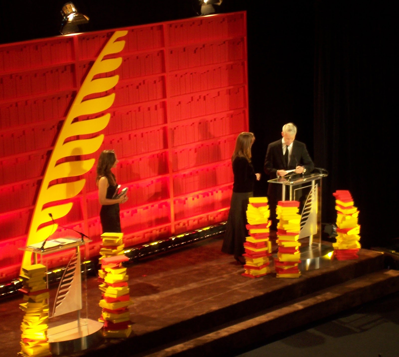 My view from the balcony. Did you notice the whale? Beneath its snout are teleprompters.By the time the TV cameras blinked on and the ceremony began, half the room--including many of the award presenters--was fully toasted. Some slurred and giggled their way through their banter. Actor Judd Hirsch went way off-script (I know because I could read his teleprompter from my seat) to recite a long book passage from memory, then dared anyone in the audience to tell him what it was from since we were all so goddam literary. I was pretty sure it was from Herman Melville's Billy Budd but decided not to leap to my feet and shout it from 50 yards away. However, I've been a big Judd Hirsch fan ever since.