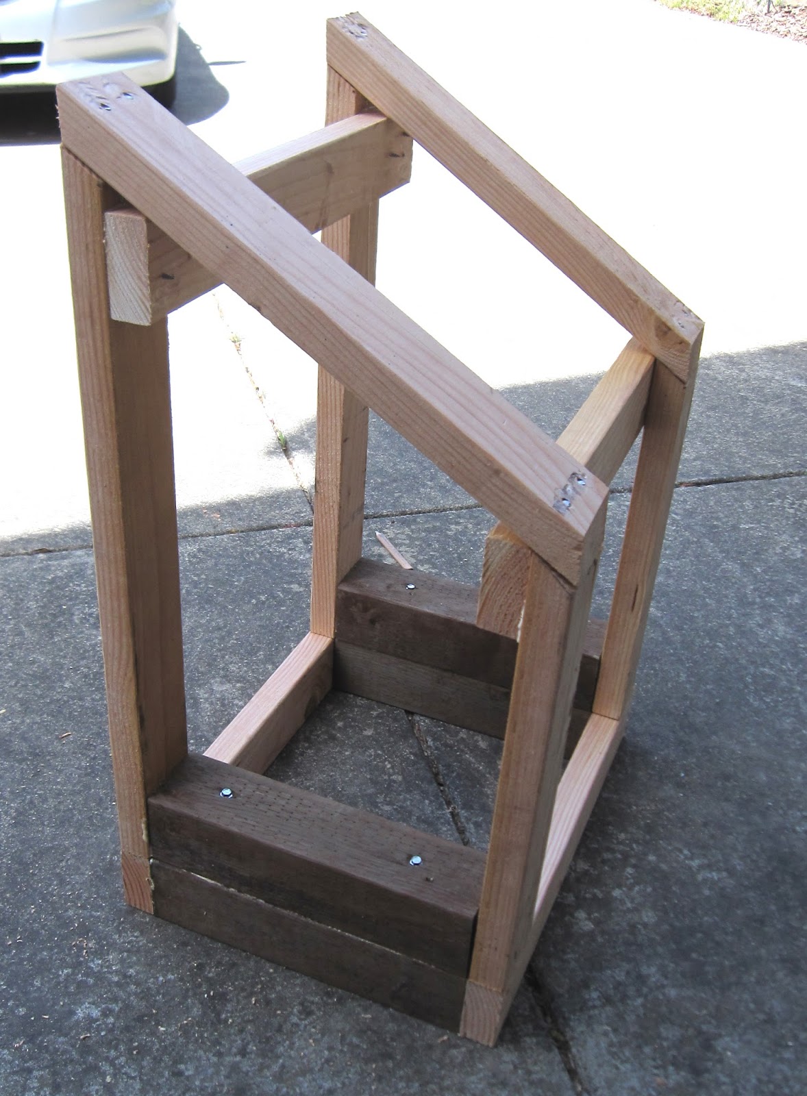 The basic frame in 2x4s and pressure-treated 4x4s. More 4x4s were added later. Not all of them were needed structurally--some were just to add weight, so that kids yanking the handles wouldn't nudge it across the floor.