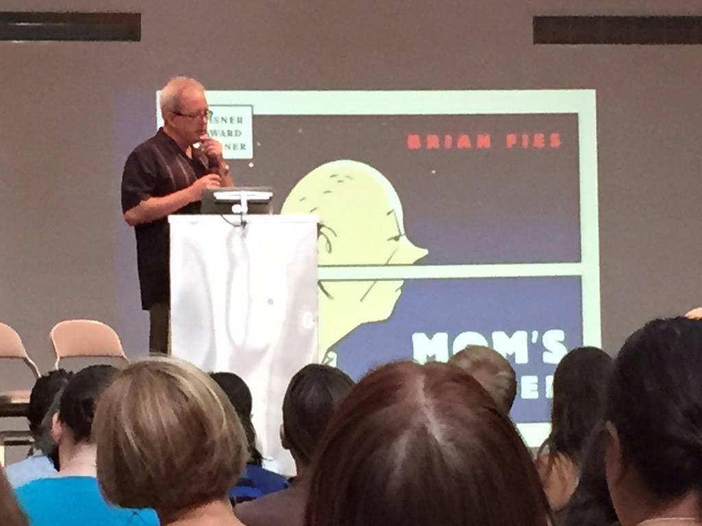 After lunch, Carol Tyler gave her keynote speech to conclude the conference. As a cartoonist this was probably my favorite of the weekend, as she talked about both her family--in ways that were sometimes emotionally overwhelming--and her process. The amount of painstaking work she dedicates to planning, plotting, outlining, writing, coloring (with home-mixed colored inks right on the originals), lettering and inking is astonishing. She's extremely good, and made it clear she got that way by working hard at it.