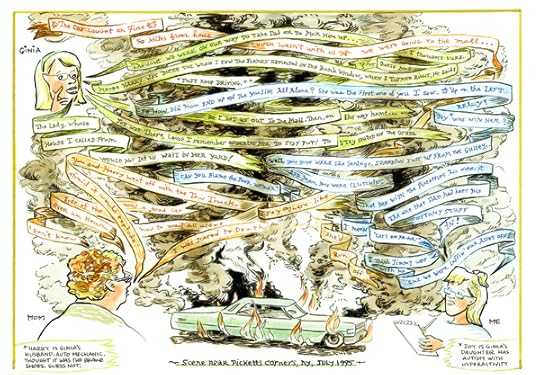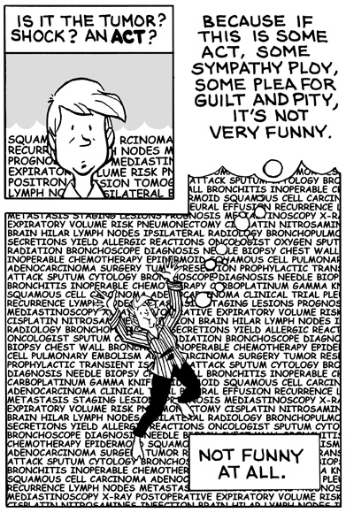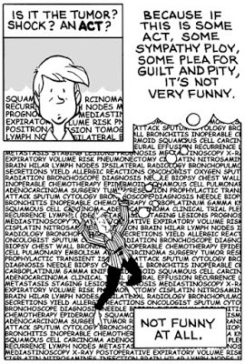 The panel of Mom drowning in a sea of medical jargon is one of the first and strongest (in my opinion) visual metaphors in Mom's Cancer. There'll be more later. A friend compared trying to absorb all the information rushing at you when you're suddenly seriously ill to drinking water from a fire hose. The ability to use this type of image is one of the reasons I decided comics was the right medium for telling my family's story.