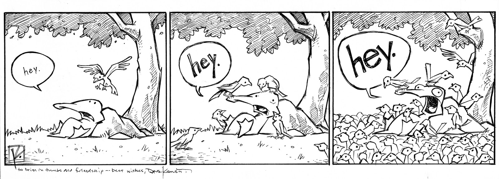 Second, I wasn't yet comfortable with digital art tools. Pasting those words into the background behind my hand-drawn figures would've been a 10-second cinch in Photoshop. Instead, I printed out the words on paper, cut out the shapes of the figures with an Xacto knife, and rubber-cemented them to the original art! It looks OK in print but the original is a gluey mess. What a maroon!