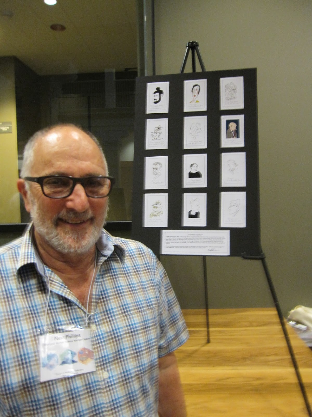 Australian psychiatrist Neil Phillips works in aboriginal public and mental health. The board behind him displays his artwork. Neil draws sketches on his phone, then prints them on good paper and offers then as limited-edition pieces. The conference included a silent auction of artwork, with proceeds going to support the Vesalius Trust for Visual Communication in the Health Sciences, which sponsored two of our keynote speakers. I bid on four of Neil's portraits but was outbid on two.