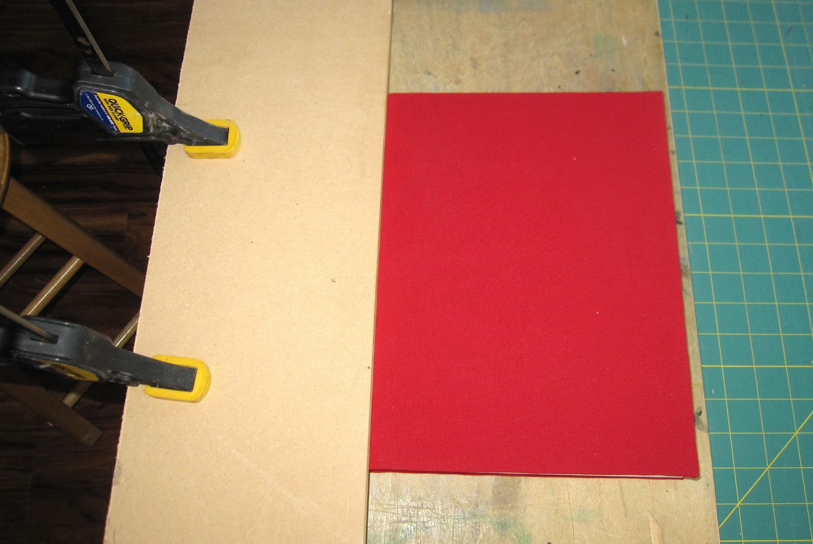 While that dried, I worked on the cover. I found a nice red cloth remnant, ironed it (can't remember the last time I used an iron), and spray-glued it to the folded matte board. Things I learned: using diluted Gorilla glue warps the matte, it's best if the cloth isn't stretchy, and the cloth has to be thin so that you can glue it down flat to the back (i.e., the inside covers).
