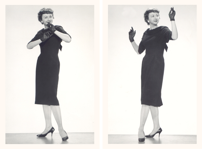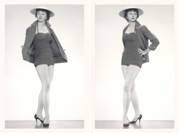 When I drew the picture of Mom modeling a swimsuit, I was relying on memories of photos I'd seen very briefly a long time before. Turns out my memory wasn't very good. Here are the actual pics of my Mom the model: