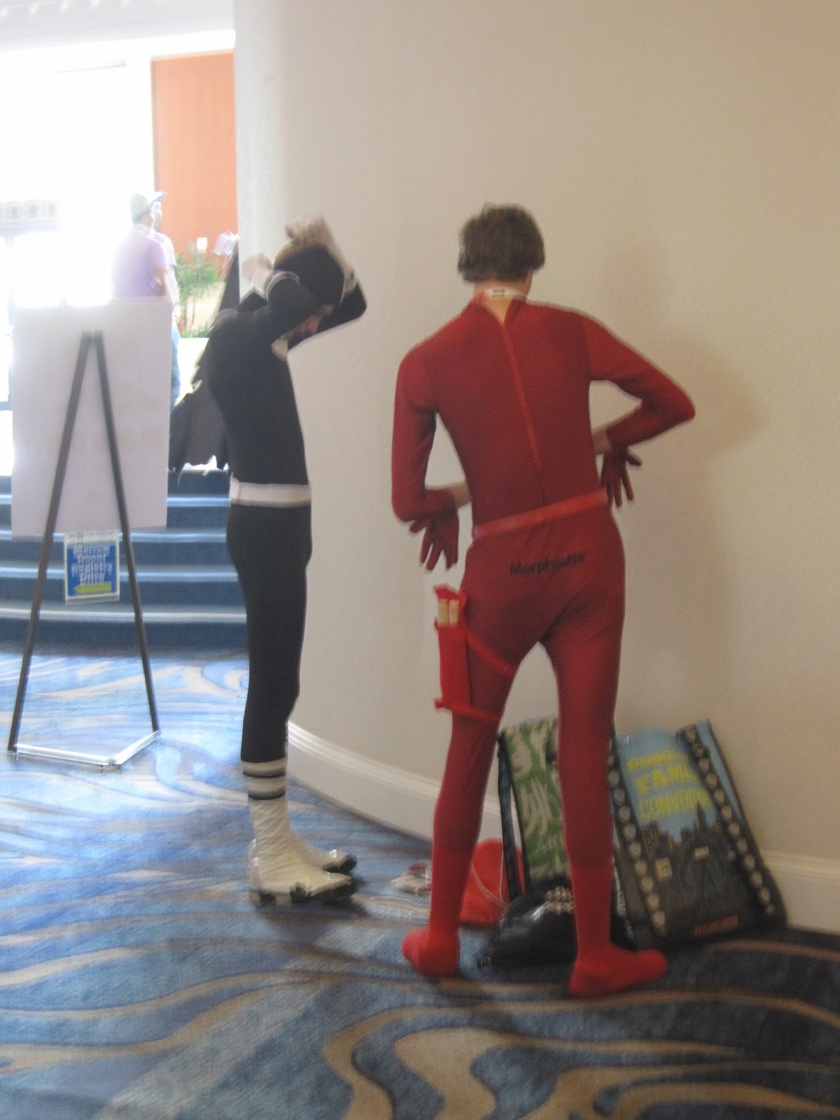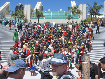 One of the things folks do at conventions is cosplayer gatherings, where people who dress in costumes with common themes--all from the same TV show, video game, or comics company--get together at a particular time for a group photo. These are people cosplaying as DC Comics characters . . .