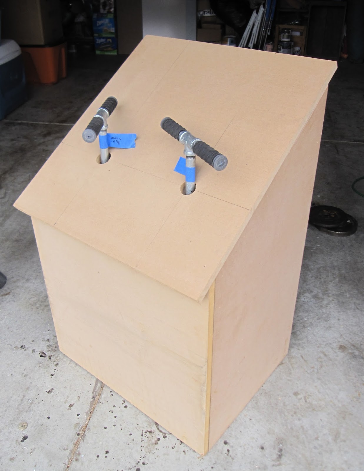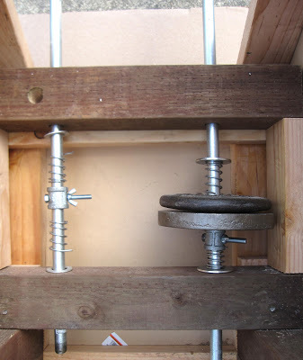 A peek at the guts. The steel pipes of the handles themselves weigh 4 pounds. Add 20 pounds of weight to one of them, and it weighs 24 pounds--six times as much as the other, exactly the difference between Moon gravity and Earth gravity. The pipes pass through holes drilled through two 4x4s. That extra hole at upper left is what we in the museum display racket call "a value-added accessory." Sounds better than "a mistake."