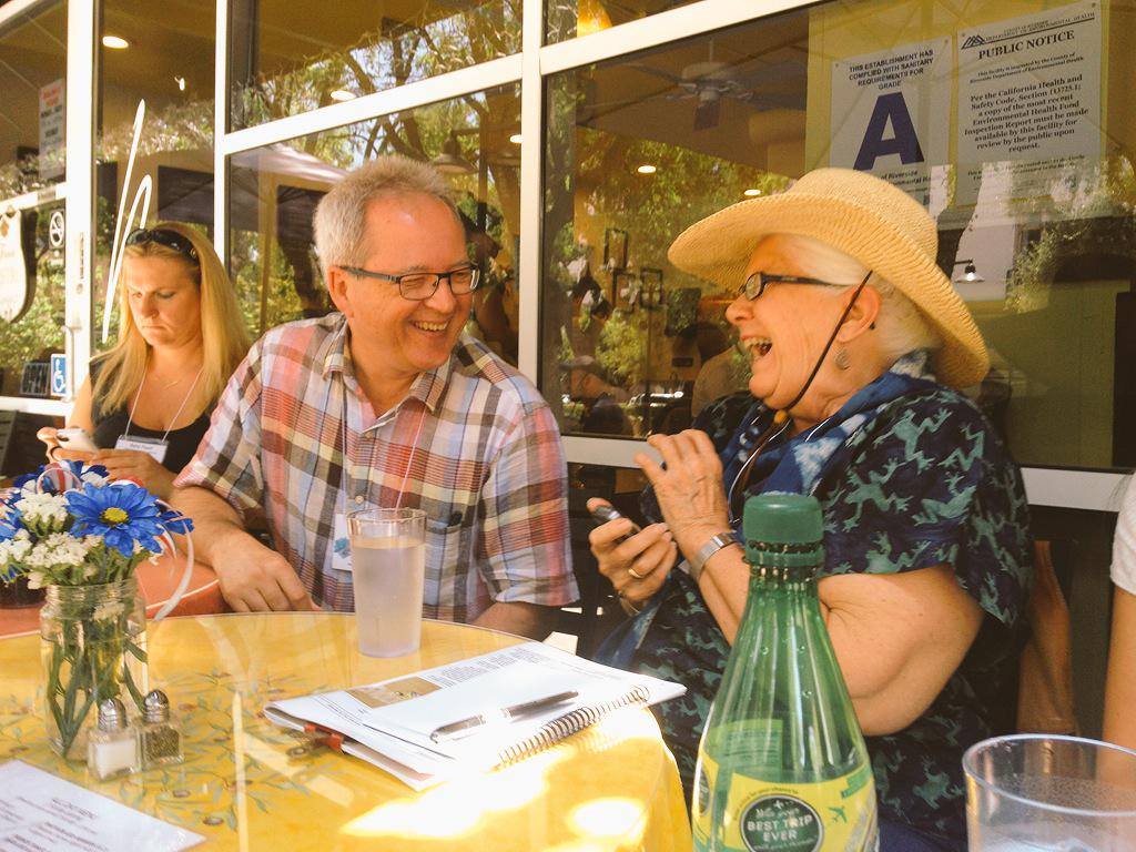 I had about 18 people (a few came late or left early), which is a good size. But I want to point out the woman sitting at the second table on the left, wearing the rust-colored blouse. That's Joyce Farmer. Now I'll switch to my large-type voice.I first met Joyce at the 2012 Comics & Medicine Conference in Toronto, where she was a keynote speaker. Juliet invited her to attend some panels in Riverside as well. Joyce was a lion of the early '70s Underground Comix scene, on a first-name basis with cartoonists like Robert Crumb and Art Spiegelman, doing passionate feminist comics in books whose titles I can't print in a family-friendly blog. In 2010 she put out a terrific graphic novel, Special Exits, about losing her parents to Alzheimer's disease. Since Toronto we've corresponded, and it was wonderful to see her in person again.