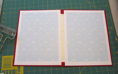 Flipped the cover over to glue down the fabric and apply the end papers, which are the light blue images of flying robots I used as a background for the webcomic.