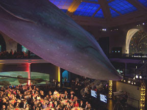 The ceremony was held in the museum's Milstein Hall, whose signature feature, impossible to miss or ignore, is a full-scale blue whale hanging from the ceiling. Round dining tables covered the floor and ringed the balcony, where we sat, and moody blue lighting gave the effect of being underwater. As comics journalist Heidi MacDonald pointed out, the setting was one supervillain away from being a Batman movie. Specifically, the bad neon-colored Schumacher one with Clooney. Food was good, wine flowed freely.