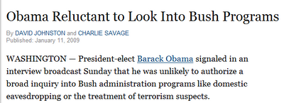When Bush officials were revealed to have established a worldwide torture regime (including tactics which Obama's Attorney General flatly stated were illegal) and spied on Americans without the warrants required by law (which Obama himself insisted was criminal), what happened? This, from The New York Times, January 11, 2009: