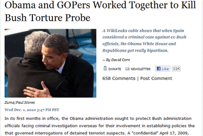 And when Spanish prosecutors decided, in light of Obama's refusal, that it would criminally investigate the torture by American officials to which its citizens were subjected by the U.S., what happened? This, from Mother Jones, December 1, 2010: