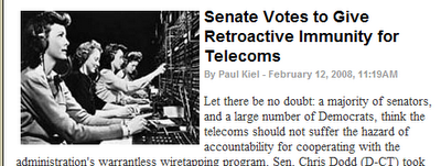 When telecoms get caught participating in Bush's illegal eavesdropping program in violation of multiple federal statutes, what happened? This, from TPM, February 12, 2008: