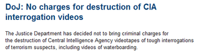 And when the CIA got caught destroying videotapes of its "interrogation" sessions with accused Terrorists even in the face of multiple court orders directing that they preserve such evidence -- acts which even the establishment-serving, rhetorically restrained co-Chairmen of the 9/11 Commission strongly suggested constituted "obstruction" of justice -- what happened? This, from Politico, November 9, 2010: